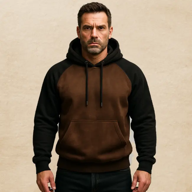 Men's Vintage Army Green Stitching Brown Suede Pocket Hoodie And Sweatpants Jogger Set